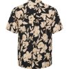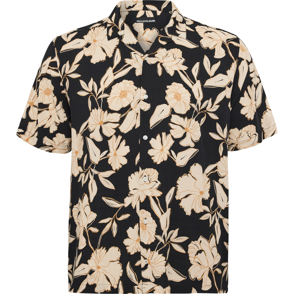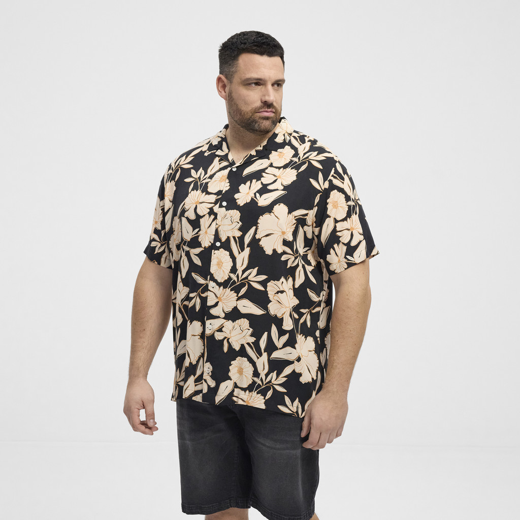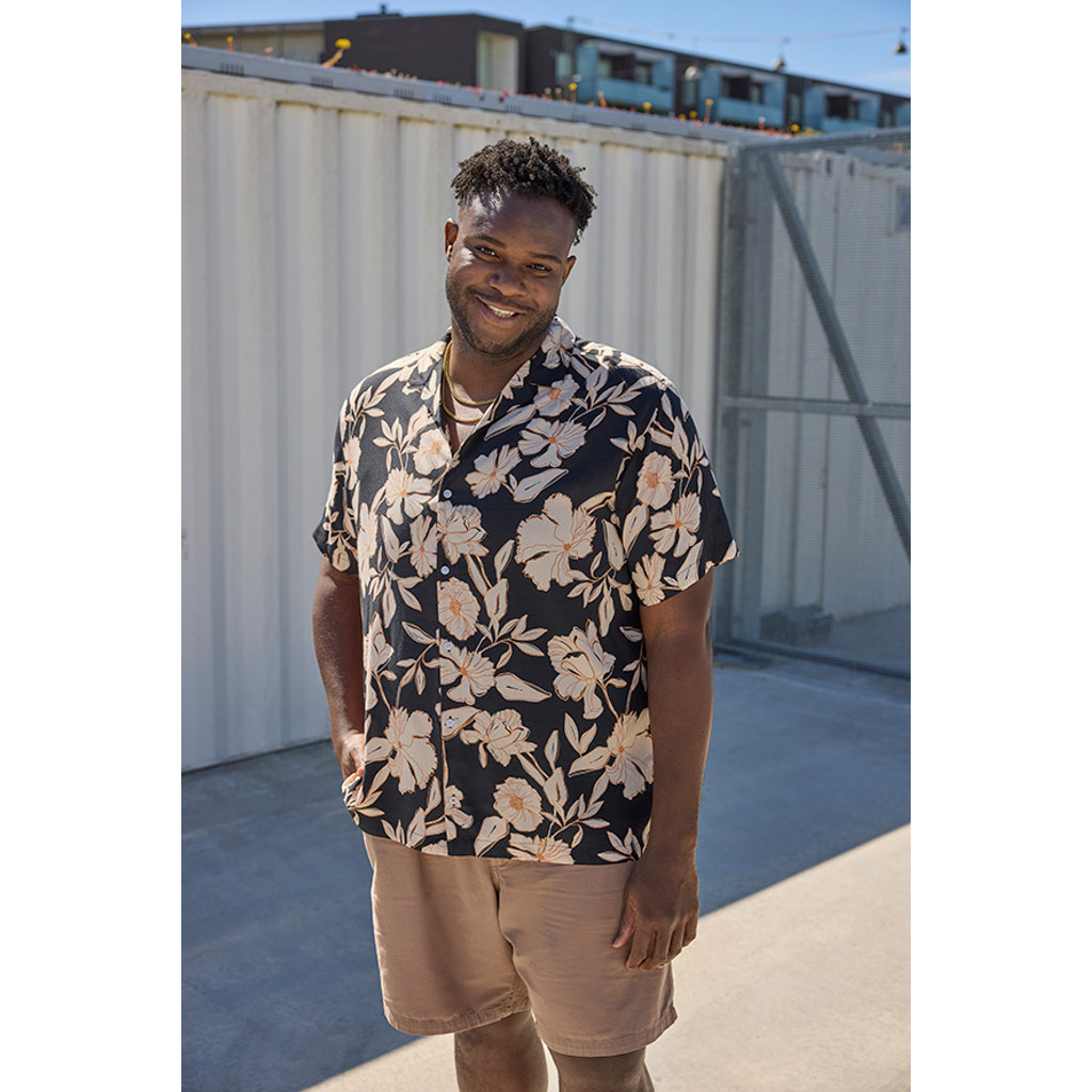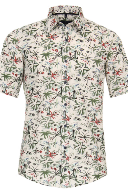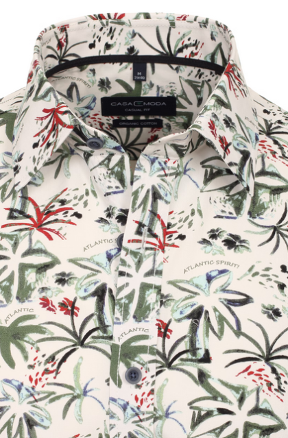 Koszula hawajska z krótkim rękawem wykonany z wysokiej jakości viskozy, cienka i przewiewna tkanina, dobrze układająca się, dająca duży komfort noszenia, kieszonka na przodzie koszulki, kołnierzyk prosty