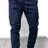 Spodnie męskie w kolorze granatowym są klasycznymi joggerami. Wykonane z lekkiego materiału ładnie dopasowują się do sylwetki. W pasie są regulowane mocnym ściągaczem i sznurkiem. Nogawki mają zakończone szerokimi ściągaczami. Posiadają dwie kieszenie z przodu.